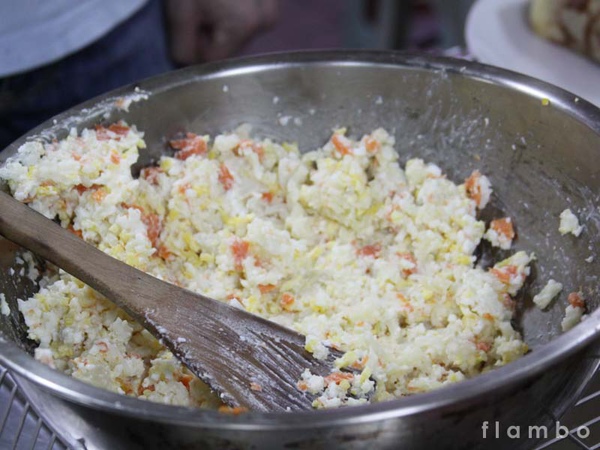 將馬鈴薯泥加上水煮蛋、沙拉醬與火腿丁等等拌勻